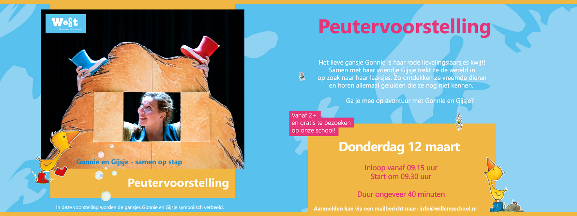 Onze jaarlijkse peutervoorstelling; Gonnie en Gijsje - Samen op stap- komt naar de Willemsschool op donderdag 12 maart a.s. om 9.15 inloop!